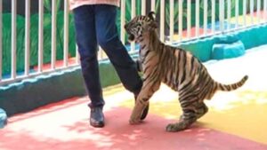 হয়েছিল। ফলে অপরটিকে আমরা মায়ের কাছ থেকে সরিয়ে আলাদা রাখি। খেলনা থেকে শুরু করে প্রয়োজনীয় সব ব্যবস্থা করা হয় শাবকটির জন্য। শিশুর মতোই ফিডারে দুধ খাওয়ানো হতো। শুরুতে বাজারে পাওয়া বিড়ালের দুধ খাওয়ানো হতো। পরে ছাগলের দুধের সঙ্গে অন্যান্য উপকরণ মিশিয়ে খাওয়ানো হয়। এতে শারীরিকভাবে বেশ পরিবর্তন আসে শাবকটির। বয়স পাঁচ মাস পূর্ণ হওয়ায় তাকে খাঁচায় দেয়া হয়েছে। তিনি আরও বলেন, শাবকটি এখন ৬০০ মিলিলিটার দুধ ও দেড় কেজি মাংস খাচ্ছে। আপাতত এক মাস অন্যান্য বাঘের পাশাপাশি খাঁচায় একা থাকবে। এর মধ্যে তাদের ভাববিনিময় যেমন হবে, তেমনি বাঘসুলভ আচার-আচরণ আয়ত্ত করবে। তার পর তাকে বাঘের খাঁচায় নেওয়া হবে।