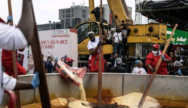 বিশাল হাঁড়িতে বিশ্বের সবচেয়ে বেশি জলফ রাইস রান্না করার চেষ্টা করছিলেন নাইজেরিয়ান শেফ এবং সাবেক গিনেস ওয়ার্ল্ড রেকর্ডধারী হিল্ডা বাচি।