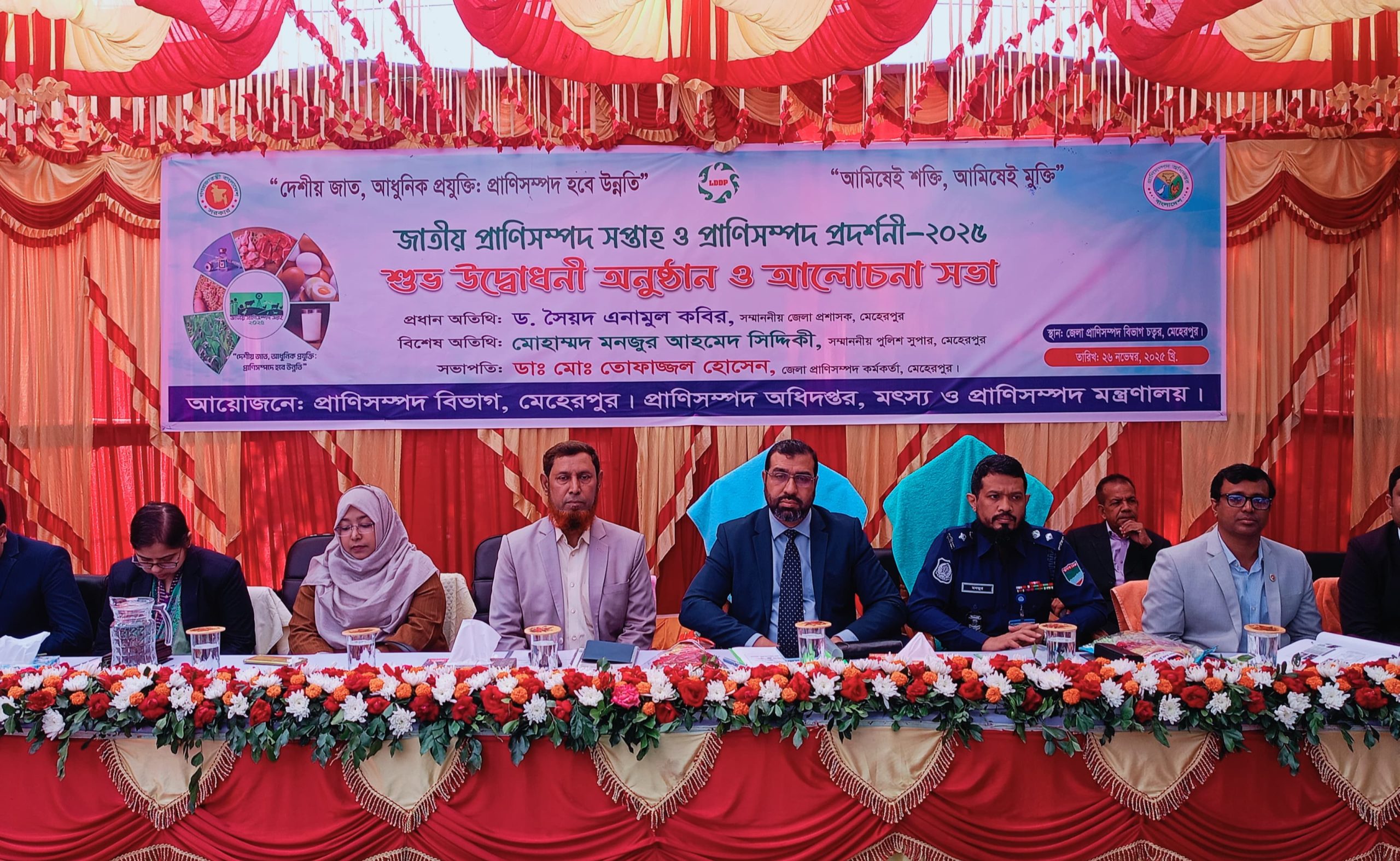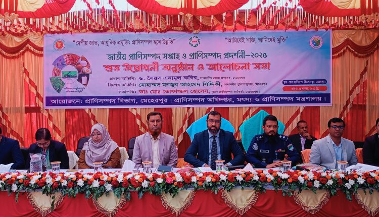 মেহেরপুর প্রতিনিধি:“দেশীয় জাত, আধুনিক প্রযুক্তি: প্রাণিসম্পদে হবে উন্নতি”—এই প্রতিপাদ্যকে সামনে রেখে মেহেরপুরে জাতীয় প্রাণিসম্পদ সপ্তাহ ও প্রাণিসম্পদ প্রদর্শনী ২০২৫-এর শুভ উদ্বোধন অনুষ্ঠিত হয়েছে। বৃহস্পতিবার সকাল সাড়ে ১০টার দিকে জেলা প্রাণিসম্পদ বিভাগ চত্বরে সপ্তাহব্যাপী কর্মসূচির আনুষ্ঠানিক উদ্বোধন করা হয়।