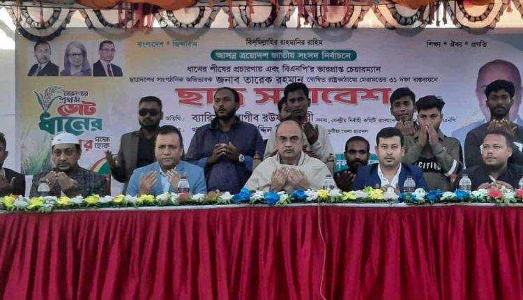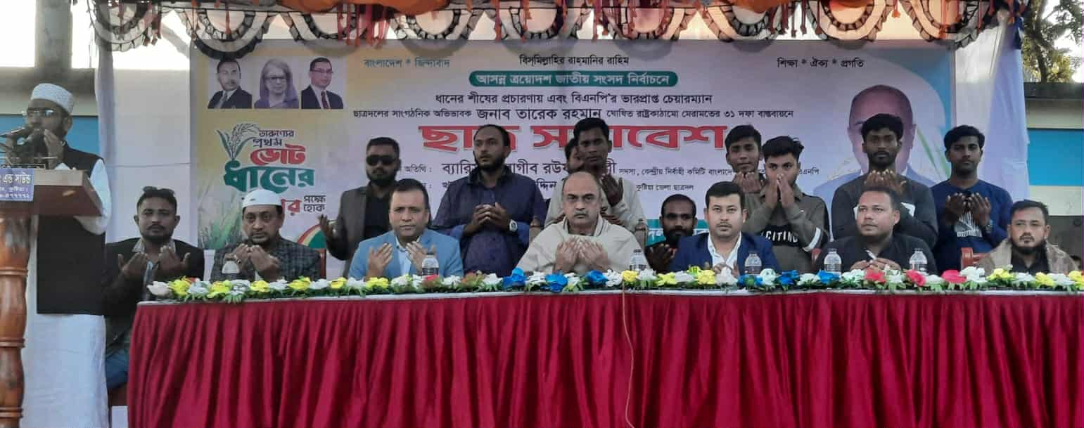 কুষ্টিয়া প্রতিনিধি:কুষ্টিয়ার মিরপুরে ত্রয়োদশ জাতীয় সংসদ নির্বাচন উপলক্ষে ধানের শীষের প্রচারণা এবং তারেক রহমান ঘোষিত রাষ্ট্র কাঠামো মেরামতের ৩১ তম বাস্তবায়নের ছাত্র সমাবেশ অনুষ্ঠিত হয়েছে। ছাত্র সমাবেশের শুরুতেই সাবেক প্রধানমন্ত্রী বিএনপির চেয়ারপার্সন বেগম খালেদা জিয়ার রোগ মুক্তি কামনায় বিশেষ দোয়া করা হয়। উপজেলা ও পৌর ছাত্রদলের যৌথ উদ্যোগে শনিবার বিকেলে মিরপুর পাইলট উচ্চ বিদ্যালয় মাঠে এ সমাবেশ অনুষ্ঠিত হয়। পৌর ছাত্রদলের আহ্বায়ক রোকনুজ্জামান রিন্টুর সভাপতিত্বে ছাত্র সমাবেশে প্রধান অতিথির বক্তব্যে বিএনপি’র জাতীয় নির্বাহী কমিটির সদস্য কুষ্টিয়া-২ (মিরপুর-ভেড়ামারা) আসনে বিএনপি মনোনীত সংসদ সদস্য পদপ্রার্থী ব্যারিস্টার রাগীব রউফ চৌধুরী বলেন, নিজের স্বার্থ জলাঞ্জলি দিয়ে দেশের মানুষের কল্যাণে কাজ করেছেন বেগম খালেদা জিয়া। তিনি ফ্যাসিস্ট সরকারের হয়রানি চূড়ান্ত শিখরে গিয়েও সেই সরকারের সঙ্গে আপোষ করেননি। দেশের গণতন্ত্র পুনরুদ্ধার করতে নির্বাচনের কোন বিকল্প নাই। তিনি বলেন এদেশের মানুষ নির্বাচনমুখী, গণতন্ত্রমুখী এবং তারা নির্বাচনে ভোটাধিকার প্রয়োগে জন্য উদগীব হয়ে আছে। দেশের স্বাধীনতাসহ সকল গণতান্ত্রিক অধিকার আদায়ের আন্দোলনে ছাত্র সমাজের অগ্রণী ভূমিকার ছিল। অনুষ্ঠানের প্রধান বক্তা ছিলেন জেলা ছাত্রদলের সদস্য সচিব খন্দকার তসলিম উদ্দিন নিশাত। এতে বিশেষ অতিথি ছিলেন ভেড়ামারা উপজেলা বিএনপির সদস্য সচিব শাজাহান আলী। উপজেলা ছাত্রদলের সদস্য সচিব ছাব্বির আহম্মেদের পরিচালনায় এ সময়ে উপজেলা যুবদলের যুগ্ম আহবায়ক কামরুজ্জামান কাকন, শরিফুল ইসলাম, উপজেলা কৃষকদলের আহবায়ক অ্যাডভোকেট খন্দকার খায়রুজ্জামান খাইরসহ অনেকই।