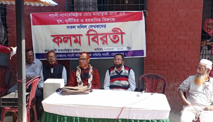 গাংনী প্রতিনিধি: গাংনী উপজেলা সাব রেজিস্ট্রার মাহফুজ রানার বিরুদ্ধে ঘুষ, দুর্নীতি ও অনিয়মতান্ত্রিকভাবে অফিস চালানোসহ আট দফা দাবিতে প্রতিবাদ সভা ও কলম বিরতি শুরু করেছে দলিল লেখকরা (মহুরা)। গতকাল বুধবার সকালে সাব রেজিস্ট্রি অফিস চত্বরে প্রতিবাদ সভা শেষে দাবি উত্থাপন করে কলম বিরতির ঘোষণা দেয়া হয়।