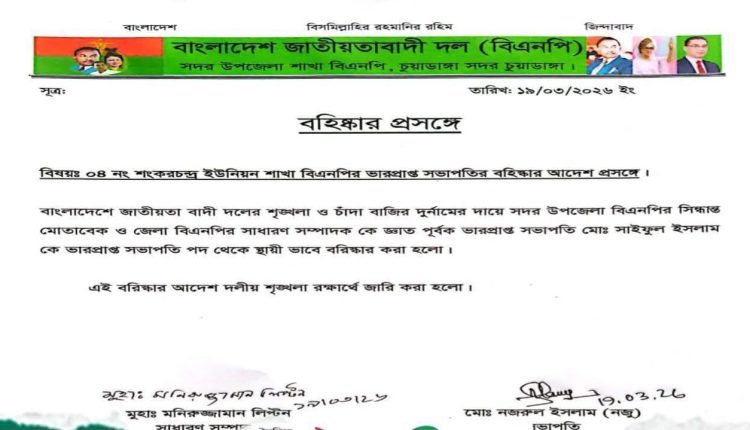 চুয়াডাঙ্গা সদর )-এর ৪ নম্বর শংকরচন্দ্র ইউনিয়ন শাখার ভারপ্রাপ্ত সভাপতি মো. সাইফুল ইসলামকে দল থেকে স্থায়ীভাবে বহিষ্কার করা হয়েছে।
