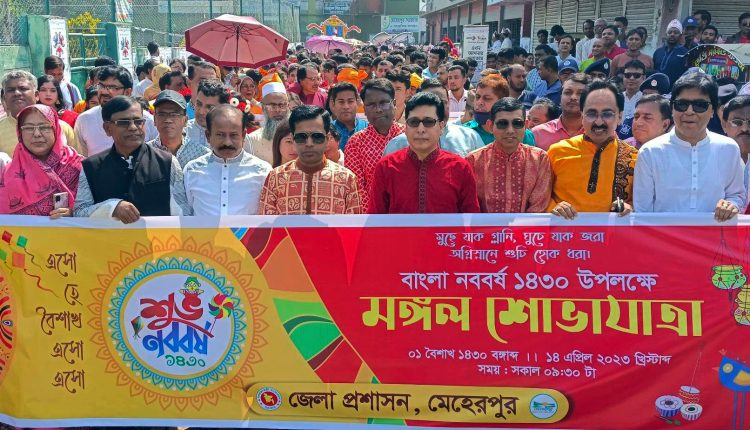 মেহেরপুর অফিস জানিয়েছে, মেহেরপুরে সকালে জেলা প্রশাসক মোহাম্মদ আজিজুল ইসলামের নেতৃত্বে মঙ্গল শোভাযাত্রা বের করা হয়। জেলা শিল্পকলা একাডেমির সামনে থেকে শুরু করে প্রধান সড়ক হয়ে মঙ্গল শোভাযাত্রাটি জেলা প্রশাসকের কার্যালয় চত্বরে গিয়ে শেষ হয়। মঙ্গল শোভাযাত্রায় নবদম্পতি, জেলে, কৃষক, বাউলসহ নানা সাজে সজ্জিত হয়ে গ্রাম বাংলার ঐতিহ্যকে ফুটিয়ে তোলা হয়। মঙ্গল শোভাযাত্রায় মেহেরপুর শহরের বিভিন্ন শিক্ষাপ্রতিষ্ঠানসহ বিভিন্ন সংগঠনের শ’শ’ নারী-পুরুষ অংশগ্রহণ করে। পরে জেলা প্রশাসকের কার্যালয়ের চত্বরে বাংলা নববর্ষকে স্বাগত জানিয়ে বক্তব্য রাখেন জনপ্রশাসন প্রতিমন্ত্রী ফরহাদ হোসেন এমপি। জেলা প্রশাসক মোহাম্মদ আজিজুল ইসলাম, পুলিশ সুপার মো. রাফিউল আলম। পরে সেখানে সাংস্কৃতিক অনুষ্ঠান অনুষ্ঠিত হয়। মেহেরপুর জেলা শিল্পকলা একাডেমী শিল্পীরা এতে সঙ্গীত, নৃত্য পরিবেশন করেন। মঙ্গল শোভাযাত্রা ও সাংস্কৃতিক অনুষ্ঠানে অন্যান্যের মধ্যে জেলা পরিষদের চেয়ারম্যান অ্যাডভোকেট আব্দুস সালাম, অতিরিক্ত জেলা প্রশাসনিক লিংকন বিশ্বাস, লিউজা-উল জান্নাহ, অতিরিক্ত পুলিশ সুপার জামিরুল ইসলাম, আজমল হোসেন, পিপি পল্লব ভট্টাচার্য, জেলা বঙ্গবন্ধু শিক্ষা ও গবেষণা পরিষদের সভাপতি প্রফেসর হাসানুজ্জামান মালেক, মেহেরপুর সরকারি কলেজের অধ্যক্ষ প্রফেসর শফিউল আলম সরদার, সরকারি মহিলা কলেজের অধ্যক্ষ প্রফেসর রফিকুল ইসলাম, মেহেরপুর জেলা আওয়ামী লীগের যুগ্মসম্পাদক অ্যাডভোকেট ইব্রাহিম শাহিন, জেলা সমাজসেবা অধিদপ্তরের উপ-পরিচালক কাজী কাদের মোহাম্মদ ফজলে রাব্বি, সদর উপজেলা পরিষদের চেয়ারম্যান অ্যাডভোকেট ইয়ারুল ইসলাম, গাংনী উপজেলা পরিষদের চেয়ারম্যান এমএ খালেক, সরকারি বালিকা উচ্চ বিদ্যালয়ের প্রধান শিক্ষক মিজানুজ্জামান, মেহেরপুর জেলা জাতীয় মহিলা সংস্থার চেয়ারম্যান শামীম আরা হীরা, টিটিসি’র অধ্যক্ষ আরিফ হোসেন তালুকদার প্রমুখ উপস্থিত ছিলেন। এদিকে জেলার বিভিন্ন সরকারি-বেসরকারি শিক্ষাপ্রতিষ্ঠানের শিক্ষক-শিক্ষার্থীরা আলোচনাসভা ও সাংস্কৃতিক অনুষ্ঠানের মাধ্যমে বাংলা নববর্ষ-১৪৩০ কে বরণ করে নেয়া হয়।