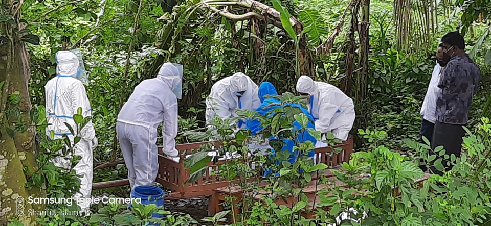 আলমডাঙ্গা থানার অফিসার ইনচার্জ আলমগীর কবীর জানান, সকালে বাংলাদেশ ইসলামি ফাউন্ডেশনের সহায়তায় একটি অ্যাম্বুলেন্সে মরদেহ আলমডাঙ্গায় নিয়ে আসা হয়। উপজেলা নির্বাহী অফিসার লিটন আলী ও উপজেলা স্বাস্থ্য পরিবার পরিকল্পনা কর্মকর্তা হাদী জিয়া উদ্দিন আহম্মেদ সাঈদের উপস্থিতিতে স্বাস্থ্যবিধি মেনে তাকে পৌর জান্নাতুল বাকী কবরস্থানে দাফন করা হয়েছে।