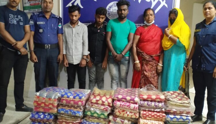 দর্শনা অফিস: দর্শনা থানা পুলিশ ঝাটিকা অভিযান চালিয়ে গ্রেফতার করেছে ভারতীয় তিন ব্যক্তিসহ ৫ জনকে। উদ্ধার করেছে ৮৪ পিস ভারতীয় শাড়ী ও একটি প্রাইভেটকার। তাদের বিরুদ্ধে দায়ের করা হয়েছে মামলা। গতকাল রোববার সন্ধ্যা সাড়ে ৬ টার দিকে দর্শনা থানার অফিসার ইনচার্জ এএইচএম লুৎফুল কবীরের নির্দেশে এসআই নীতিশ বিশ্বাস, এসআই শামীম হাসান ও এএসআই আবুবক্কর সিদ্দিক গোপন সংবাদের ভিত্তিতে সঙ্গীয় ফোর্স নিয়ে অভিযান চালান দর্শনা পৌর এলাকার শ্যমপুর জোড়া বটতলা এলাকায়। পুলিশ ওই এলাকার তিন রাস্তার মোড়ে একটি প্রাইভেটকারের (যার রেজি নং যশোর-খ- ১১-০০১০) গতিরোধ করে। প্রাইভেটকার থেকে উদ্ধার করা হয় ৮৪ পিস ভারতীয় শাড়ী। গ্রেফতার করা হয় ভারতের উত্তর চব্বিশ পরগনা জেলার বোনগা থানার নয়া গোপালগঞ্জ গ্রামের রজব ভৌমিকের স্ত্রী সন্ধ্যা ভৌমিক (৪৪), একই এলাকার চিত্তরঞ্জন দাসের স্ত্রী মঞ্জু দাস (৬০), একই জেলার পেট্টোপোল থানা সদরের আইয়ুব আলীর ছেলে সালাম (২৪), যশোর বেনাপোল থানার বড় আচড়া গ্রামের মিন্টু রহমানের ছেলে মেহেদী হাসান (২৬) ও একই থানার সাদিপুর বেলতলা গ্রামের মফিজুর রহমানের ছেলে সাব্বির রহমানকে (২১)। পুলিশের পক্ষ থেকে বলা হয়েছে, একটি প্রাইভেটকার ও ৮৪ পিস ভারতীয় শাড়ী উদ্ধার করা হয়েছে। এ ঘটনায় এসআই নীতিশ বিশ্বাস বাদী হয়ে তিন ভারতীয়সহ ৫ জনের বিরুদ্ধে গতকালই দর্শনা থানায় মামলা দায়ের করেছেন।