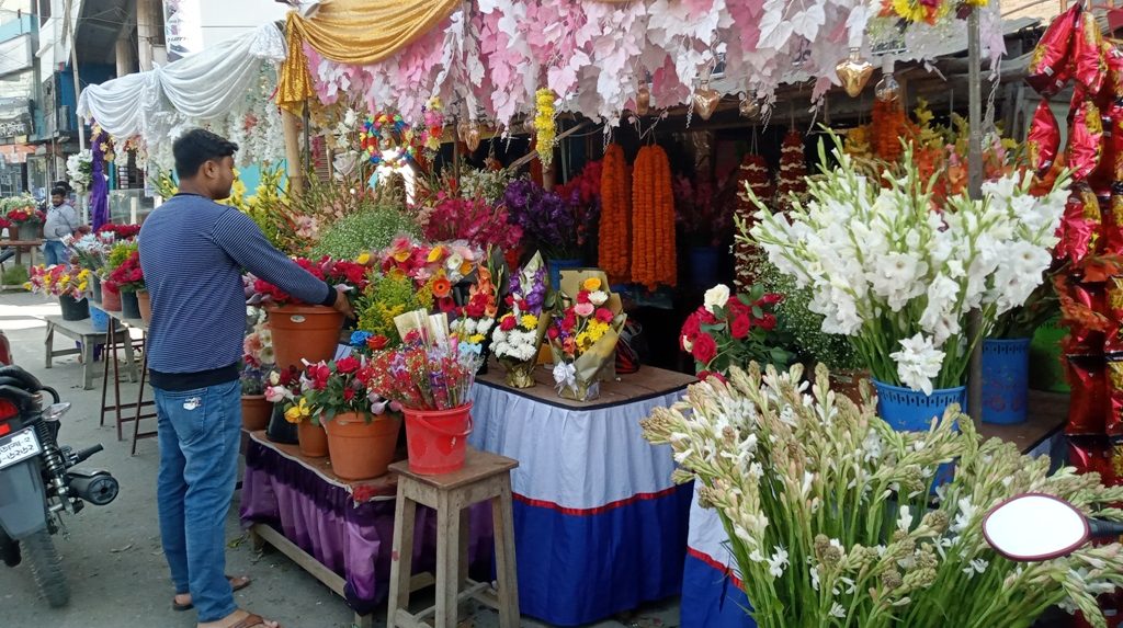 চুয়াডাঙ্গা শহরের ফুলের দোকানিগুলোতে বাহারি সব ফুল দিয়ে পসরা বসিয়েছেন। এসব দোকানেও ক্রেতারা ভিড় করেন ফুল কেনার জন্য। পয়লা ফাল্গুন আর ভালোবাসা দিবসকে ঘিরে কদর বেড়েছে সব ধরনের ফুলের। এ জন্য দামও বেড়েছে কয়েকগুণ। অন্য সময় ১০ টাকায় বিক্রি হওয়া একটি লাল গোলাপের দাম হাকানো হচ্ছে ৫০ টাকা। তবুও ভালোবাসার মানুষের জন্য ফুল কিনতে দোকানে দোকানে ভিড় জমাচ্ছেন ক্রেতারা। ব্যস্ত সময় পার করতে দেখা যায় ফুল ব্যবসায়ীদের। এতে করে ফুল বেচাকেনার জন্য নির্ধারিত স্থানের সীমানা পেরিয়ে ফুটপাতেও নানা রঙের ফুল বিক্রি করতে দেখা যায়।