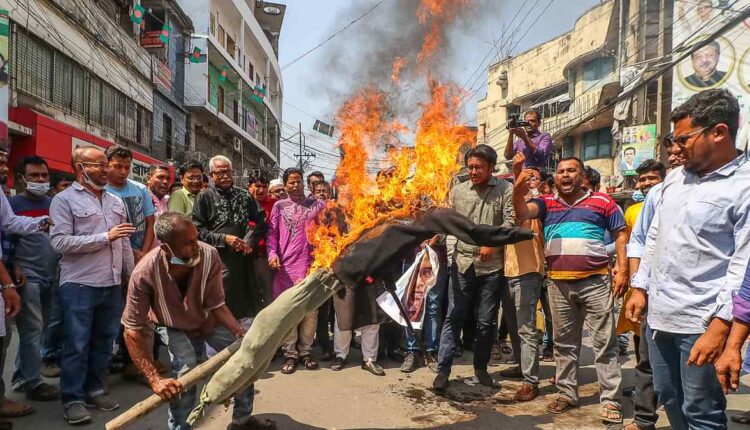 খুলনা ব্যুরো: বিএনপির ভাইস চেয়ারম্যান চুয়াডাঙ্গা-১ আসনের সাবেক সাংসদ শামসুজ্জামান দুদুকে খুলনায় অবাঞ্ছিত ঘোষণা করা হয়েছে। একই সঙ্গে তার কুশপুত্তলিকা দাহ করে প্রতিবাদ সমাবেশ করেছে আওয়ামী লীগ। রোববার দুপুরে খুলনা নগরের পিকচার প্যালেস মোড়ে বিএনপির ওই নেতার কুশপুত্তলিকা দাহ করা হয়। এ সময় আওয়ামী লীগ নেতারা বলেন, শনিবার বিকেলে খুলনায় অনুষ্ঠিত সমাবেশে বিএনপি নেতা দুদু প্রধানমন্ত্রী শেখ হাসিনা, খুলনা সিটি করপোরেশনের মেয়র তালুকদার আব্দুল খালেক ও আওয়ামী লীগ নেতাদের নিয়ে কুৎসিত বক্তব্য দেন। এর প্রতিবাদে দুদুর কুশপুত্তলিকা দাহ করা হয়। অবিলম্বে জাতির সামনে ক্ষমা না চাইলে তার বিরুদ্ধে কঠোর ব্যবস্থা গ্রহণ করা হবে।