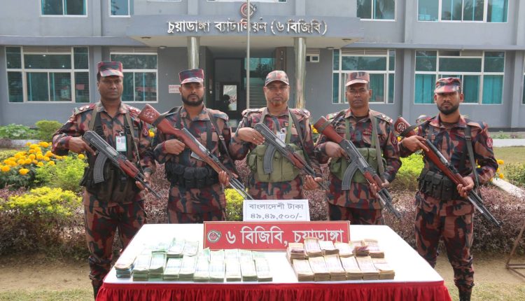চুয়াডাঙ্গার দামুড়হুদা সীমান্তে প্রায় কোটি টাকার সোনার বার উদ্ধারের পর এবার মুন্সিপুর সীমান্তের জিরো পয়েন্ট থেকে অর্ধকোটি টাকা উদ্ধার করা হয়েছে। মঙ্গলবার দুপুরে বিজিবি এ খবর নিশ্চিত করেছে। চুয়াডাঙ্গা ব্যাটালিয়নের (৬ বিজিবি) সদর দপ্তর থেকে পাঠানো সংবাদ বিজ্ঞপ্তিতে বলা হয়, গত সোমবার সন্ধ্যায় দামুড়হুদা উপজেলার মুন্সিপুর সীমান্ত ফাঁড়ির বিওপি কমান্ডার নায়েব সুবেদার মো. আলাউদ্দিনের নেতৃত্বে সশস্ত্র টহল দল নিয়মিত রাত্রিকালীন টহল দিচ্ছিলো। সন্ধ্যা ৭টা ১০ মিনিটের দিকে অজ্ঞাতনামা দুই ব্যক্তিকে দুটি ব্যাগ হাতে নিয়ে ভারত থেকে বাংলাদেশ সীমান্তে প্রবেশ করতে দেখেন টহল দলের সদস্যরা। কিছু সময়ের মধ্যে বিজিবি টহল দলের উপস্থিতি টের পেয়ে দুই ব্যক্তি পালিয়ে যাওয়ার চেষ্টা করেন। বিজিবি সদস্যরা এ সময় দুই দলে ভাগ হয়ে ধাওয়া করলে ওই দুই ব্যক্তি তাদের সঙ্গে থাকা দুটি ব্যাগ ফেলে ভারতের দিকে পলিয়ে যান।