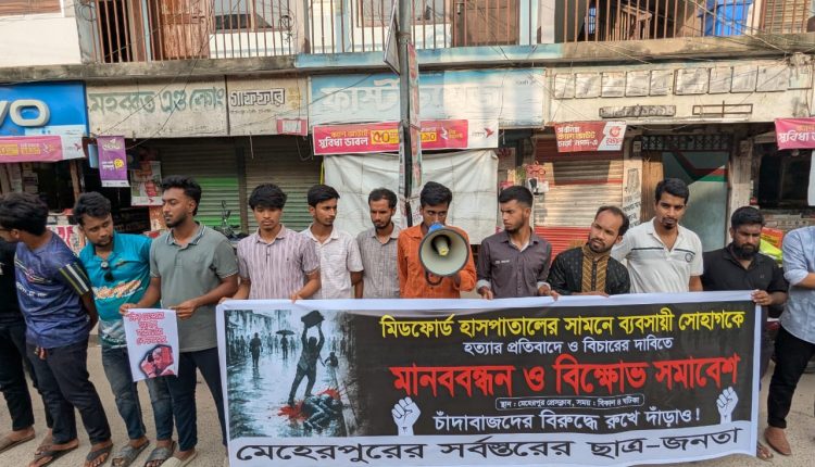 মেহেরপুর অফিস জানিয়েছে, রাজধানীর মিটফোর্ড হাসপাতালে ব্যবসায়ী সোহাগকে নৃশংসভাবে কুপিয়ে হত্যার প্রতিবাদে এবং হত্যাকা-ে জড়িতদের দ্রুত গ্রেফতারের দাবিতে মেহেরপুরে মানববন্ধন ও বিক্ষোভ সমাবেশ অনুষ্ঠিত হয়েছে। গতকাল শনিবার বিকেলে মেহেরপুর প্রেসক্লাবের সামনে মেহেরপুরের সর্বস্তরের ছাত্র-জনতার ব্যানারে এ কর্মসূচির আয়োজন করা হয়। এতে বিভিন্ন শ্রেণিপেশার মানুষ, শিক্ষার্থী এবং সচেতন নাগরিকরা অংশ নেন। মানববন্ধনে বক্তারা বলেন, চাঁদাবাজ ও সন্ত্রাসীদের হাতে একজন সাধারণ ব্যবসায়ীকে প্রকাশ্যে কুপিয়ে হত্যা করা হয়েছে। এটি শুধু একটি পরিবারের জন্য শোকের ঘটনা নয় বরং দেশের প্রতিটি ব্যবসায়ীর জন্য এক ধরনের হুমকি। অবিলম্বে দোষীদের গ্রেফতার করে দৃষ্টান্তমূলক শাস্তির দাবি জানান তারা। বক্তারা আরও বলেন, সোহাগ হত্যার মাধ্যমে সন্ত্রাসীরা রাষ্ট্র এবং বিচারব্যবস্থাকে সরাসরি চ্যালেঞ্জ জানিয়েছে। এ ঘটনা নিছক একটি হত্যাকা- নয়, এটি জাতীয় নিরাপত্তা ও শৃঙ্খলার প্রশ্ন। সমাবেশে অংশগ্রহণকারীরা বিভিন্ন প্ল্যাকার্ড বহন করেন। প্ল্যাকার্ডে লেখা ছিল “সোহাগ হত্যার বিচার চাই, চাঁদাবাজদের বিরুদ্ধে রুখে দাঁড়াও, ব্যবসায়ী হত্যার রাজনীতি বন্ধ করো” ইত্যাদি সেøাগান।