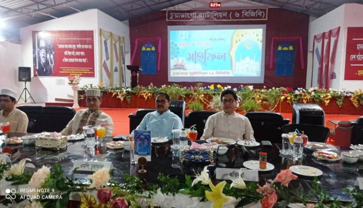 বিজিবির ইফতার মাহফিলে প্রধান অতিথি ছিলেন জনপ্রশাসন প্রতিমন্ত্রী ফরহাদ হোসেন এমপি। তিনি ৬ বিজিবি কর্তৃপক্ষকে দোয়া ও ইফতার মাহফিল আয়োজনের ভূয়সী প্রসংশা করে বলেন, বর্ডারগার্ড বাংলাদেশ সরকারের একটি প্রশিক্ষিত ও চৌকস বাহিনী। যা দেশের সীমান্ত রক্ষায় ও দেশের মানুষের জান-মাল রক্ষায় অতন্ত্র প্রহরীর ভূমিকা পালন করে থাকে। এটি আত্মত্যাগ ও দেশ মাতৃৃকার সেবারই নামান্তর। তিনি বলেন, এতদাঞ্চলের সীমান্ত রক্ষায় বিজিবির আরও একটি ইউনিট প্রতিষ্ঠা করা হবে। যেটি হবে মেহেরপুরে। প্রধান অতিথির বক্তব্যের আগে বর্ডারগার্ড বাংলাদেশের (বিজিবি/বিডিআর) প্রতিষ্ঠাকালীন সময় থেকে অদ্যাবধি নানা বীরত্বগাথা নিয়ে একটি ভিডিও ডকুমেন্টারি প্রদর্শন করা হয়। অনুষ্ঠানে আমন্ত্রিত অতিথিদের মধ্যে উপস্থিত ছিলেন চুয়াডাঙ্গা-২ আসনের সংসদ সদস্য হাজি আলী আজগার টগর, বিজিবি কুষ্টিয়া সেক্টর কমান্ডার কর্ণেল মহিউদ্দীন জাবেদ, চুয়াডাঙ্গা জেলা প্রশাসক মোহাম্মদ আমিনুল ইসলাম খান, বিজিবি হাসপাতালের সিও লে. কর্ণেল নাজাত সুলতানা, মেহেরপুর জজকোর্টের পিপি পল্লব ভর্টাচার্য, চুয়াডাঙ্গা জজ কোর্টের পিপি বেলাল হোসেন, চুয়াডাঙ্গা প্রেসক্লাবের সাধারণ সম্পাদক রাজীব হাসান কচিসহ আমন্ত্রিত অতিথিগণ। দোয়া পরিচালনা করেন বিজিবি জামে মসজিদের ঈমাম মাও. আবুল বাশার নুরী।