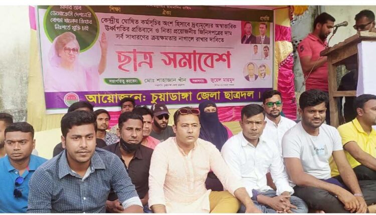 স্টাফ রিপোর্টার: নিত্যপ্রয়োজনীয় দ্রব্যমূল্যের লাগামহীন ঊর্র্ধ্বগতির প্রতিবাদ ও পণ্যমূল্য খেটে খাওয়া মানুষের নাগালে আনার দাবিতে চুয়াডাঙ্গায় বিক্ষোভ সমাবেশ করেছে জেলা ছাত্রদল। বাংলাদেশ জাতীয়তাবাদী ছাত্রদলের কেন্দ্রীয় কর্মসূচির অংশ হিসেবে রোববার বেলা ৩টার দিকে জেলা শহরের পুরাতন সাহিত্য পরিষদ চত্বরে এ সমাবেশ অনুষ্ঠিত হয়। চুয়াডাঙ্গা জেলা বিএনপির আহ্বায়ক মাহমুদ হাসান খান বাবু ও সদস্য সচিব শরিফুজ্জামান শরীফের নির্দেশনায় অনুষ্ঠিত সমাবেশে সভাপতিত্ব করেন জেলা ছাত্রদলের সভাপতি মো. শাজাহান খান।