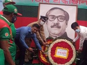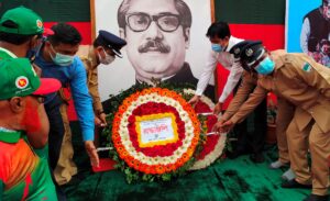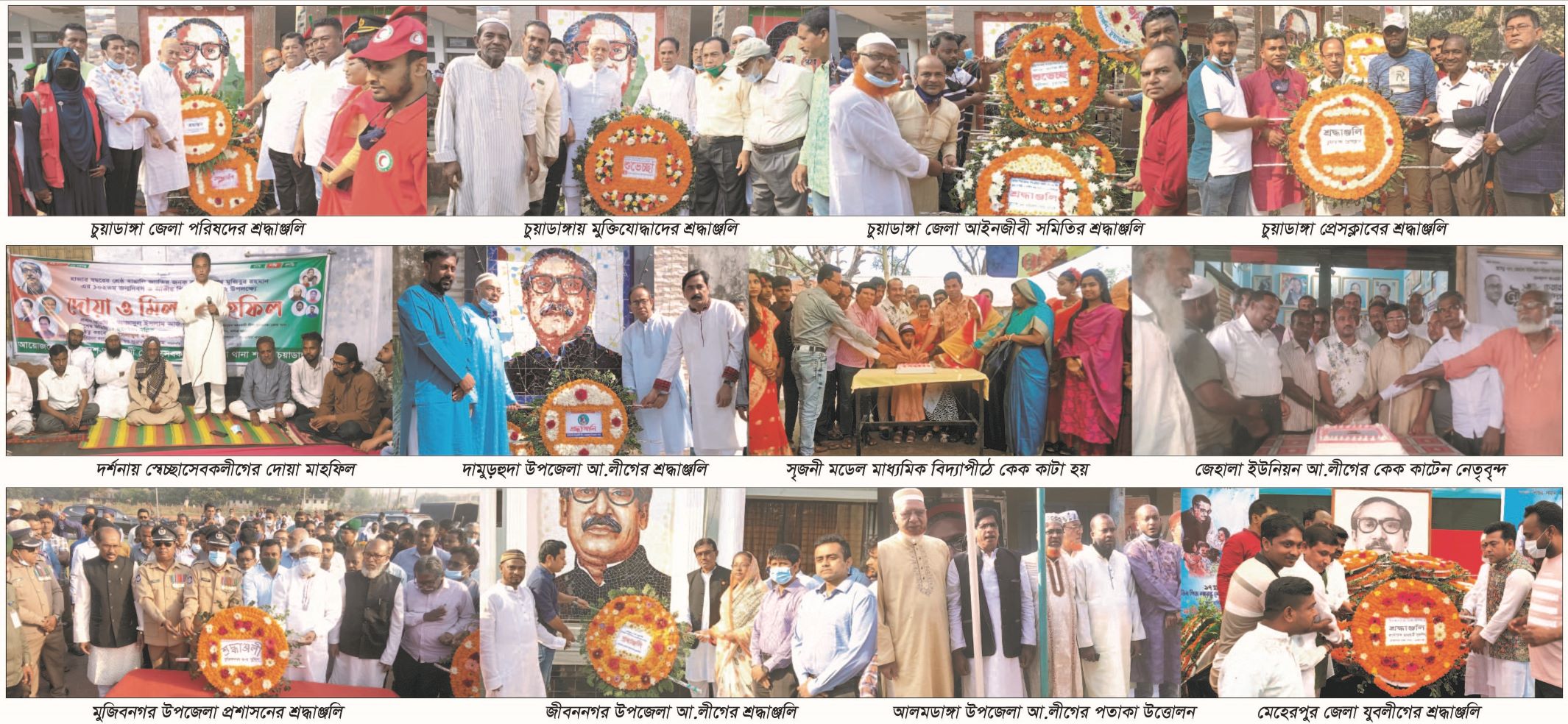 মেহেরপুর অফিস জানিয়েছে, মেহেরপুর জেলা প্রশাসনের উদ্যোগে গতকাল বৃহস্পতিবার সকাল ৯টায় জেলা প্রশাসকের কার্যালয় চত্বরে বিশেষভাবে নির্মিত জাতির পিতা বঙ্গবন্ধু শেখ মুজিবুর রহমানের প্রতিকৃতিতে শ্রদ্ধা জানিয়ে পুষ্পমাল্য অর্পণ করা হয়। জেলা প্রশাসক ড. মোহাম্মদ মুনসুর আলম খান সর্বপ্রথম জনপ্রশাসন প্রতিমন্ত্রী ফরহাদ হোসেন এমপি এবং মেহেরপুর জেলাবাসীর পক্ষ পুষ্পমাল্য অর্পণ করেন। এরপর পরই পুলিশ বিভাগের পক্ষে পুলিশ সুপার রাফিউল আলম, মুক্তিযোদ্ধাদের পক্ষে ক্যাপ্টেন (অব.) আব্দুল মালেক ও জেলা শিল্পকলা একাডেমির পক্ষে সাধারণ সম্পাদক অধ্যাপক সাইদুর রহমান, জেলা পরিষদের পক্ষে জেলা পরিষদের চেয়ারম্যান আলহাজ গোলাম রসূল, মেহেরপুর পৌরসভা মেয়র ও জেলা যুবলীগের পক্ষে আহ্বায়ক মাহফুজুর রহমান রিটন, জেলা আওয়ামী লীগের পক্ষে সহসভাপতি আবদুস সামাদ বাবলু বিশ্বাস, পৌর আওয়ামী লীগের পক্ষে সদর উপজেলা চেয়ারম্যান অ্যাড. ইয়ারুল ইসলাম, সরকারি কলেজের পক্ষে অধ্যক্ষ প্রফেসর শফিউল আলম সরদার, সরকারি মহিলা কলেজের পক্ষে অধ্যক্ষ প্রফেসর রফিকুল ইসলাম, ছহিউদ্দীন ডিগ্রি কলেজের পক্ষ অধ্যক্ষ একরামুল আজিম, টিটিসির পক্ষে অধ্যক্ষ আরিফ আহমেদ, জেলা মহিলা আওয়ামী লীগের পক্ষে সাধারণ সম্পাদিকা লাভলী ইয়াসমিন, সামাজিক বন বিভাগের পক্ষে জাফরুল্লাহ, জেলা মাদকদ্রব্য নিয়ন্ত্রণ অধিদপ্তরের পক্ষে পরিদর্শক আব্দুল মান্নান, ফায়ার সার্ভিস ও সিভিল ডিফেন্সের পক্ষে উপ-সহকারী পরিচালক নজমুজ্জামানসহ বিভিন্ন স্কুল-কলেজ এবং সামাজিক ও সাংস্কৃতিক সংগঠনের পক্ষ থেকে বঙ্গবন্ধুর প্রতিকৃতিতে পুষ্পমাল্য অর্পণ করেন।