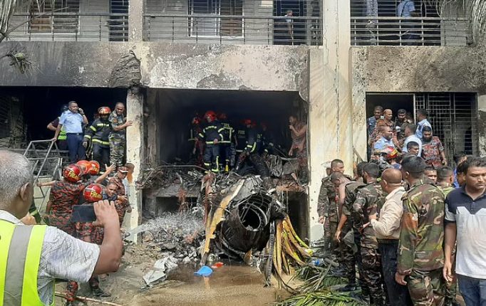 হঠাৎ আকাশ থেকে ছুটে আসা একটি যুদ্ধবিমান বিধ্বস্ত হয়ে আছড়ে পড়লো স্কুলের মূল গেটের সামনে স্কুলের কক্ষগুলোতে ঢুকে পড়লো আগুনের লেলিহান শিখা ; নিহত অন্তত ২০ : আজ রাষ্ট্রীয় শোক হাসপাতালে শুয়ে কাতরা”েছ দেড় শতাধিক শিশু ও অভিভাবক : বাতাসে হাহাকার সান্ত¡না মিলবে কিসে