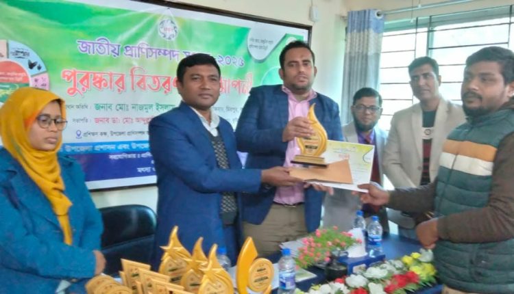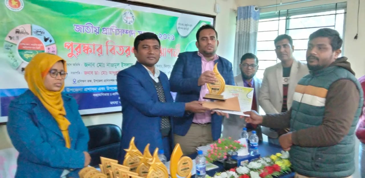 কুষ্টিয়া প্রতিনিধি:কুষ্টিয়ার মিরপুরে জাতীয় প্রাণিসম্পদ সপ্তাহের সমাপনী উপলক্ষে পুরষ্কার বিতরণ করা হয়েছে। এ উপলক্ষে উপজেলা প্রশাসন এবং উপজেলা প্রাণিসম্পদ ও ভেটেরিনারি হাসপাতালে যৌথ উদ্যোগে ও প্রাণিসম্পদ ও ডেইরী উন্নয়ন প্রকল্প (এলডিডিপি)’র সহযোগিতায় বৃহস্পতিবার দুপুরে প্রাণিসম্পদের প্রশিক্ষণ রুমে এক আলোচনা সভা অনুষ্ঠিত হয়।উপজেলা প্রাণিসম্পদ কর্মকর্তা ডাঃ আব্দুল্লাহিল কাফির সভাপতিত্বে অনুষ্ঠানে প্রধান অতিথি ছিলেন উপজেলা নির্বাহী কর্মকর্তা নাজমুল ইসলাম। এতে বিশেষ অতিথি ছিলেন উপজেলা সহকারী কমিশনার (ভূমি) ঈষিতা আক্তার, মিরপুর থানার ওসি শহিদুল ইসলাম, উপজেলা শিক্ষা কর্মকর্তা কে এম গোলাম মহিউদ্দিন, উপজেলা প্রকল্প বাস্তবায়ন মাহফুজুর রহমান, সোনালী ব্যাকের এজিএম শামসুল ইসলাম, পৌরসভার সচিব আব্দুল হান্নান, প্রেসক্লাবের সভাপতি মারফত আফ্রিদী, সাধারণ সম্পাদক রাশেদুজ্জামান রিমন প্রমুখ।
