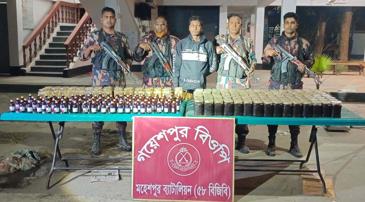 মহেশপুর ৫৮ বিজিবি ব্যাটালিয়ন সূত্রে জানা যায়, গোপন সংবাদের ভিত্তিতে গয়েশপুর বিওপির হাবিলদার বেল্লাল হোসেনের নেতৃত্বে বিজিবির একটি টিম বৃহস্পতিবার রাতে পেয়ারাতলা বাজারে মাদক বিরোধী অভিযান পরিচালনা করেন। অভিযানকালে সন্দেহভাজন ৫টি প্লাস্টিকের ক্যারেট আটক করা হয়। আটককৃত ক্যারেট হতে ১৩০ কেজি খেঁজুরের গুড় ও ৯২ বোতল ভারতীয় নতুন মাদক উইনকোরেক্স উদ্ধারসহ মুকুল মিয়াকে (৩৫) আটক করা হয়। আটক মুকুল জীবননগর উপজেলার নতুনপাড়া গ্রামের মৃত কফিল উদ্দিনের ছেলে। অপর দিকে রাজাপুর বিওপির নায়েব সুবেদার ভুঁইয়া ইকবাল হোসেনের নেতৃত্বে বিজিবির অপর একটি টিম রাজাপুর গ্রামের নৈমুদ্দিন মন্ডলের আম বাগানের মধ্যে অভিযান পরিচালনা করেন। অভিযানকালে আসামীবিহীন অবস্থান ২৪ বোতল ফেনসিডিল উদ্ধার করা হয়। মহেশপুর ৫৮ বিজিবি ব্যাটালিয়নের সহকারী পরিচালক মুন্সী ইমদাদুর রহমান বিষয়টি প্রেস বিজ্ঞপ্তির মাধ্যমে সাংবাদিকদের নিশ্চিত করেছেন।