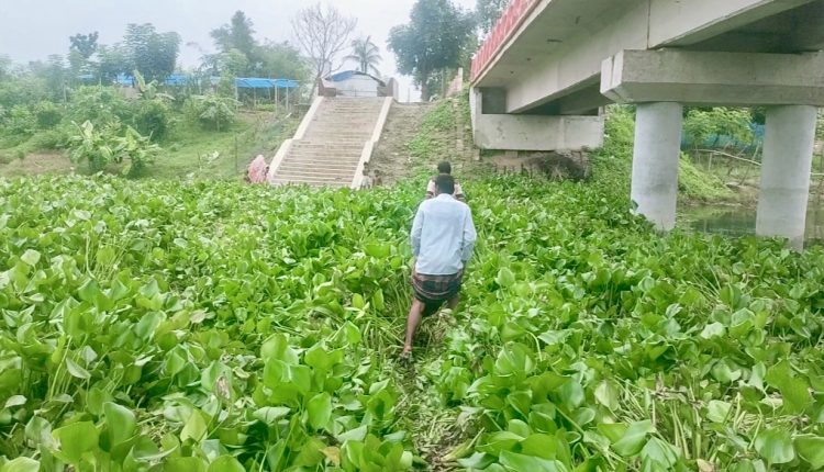 দামুড়হুদার চারুলিয়া-হেমায়েতপুর ভৈরব নদে জমাট বাঁধা কচুরিপানা তৈরি হলো অস্থায়ী খেলার মাঠ