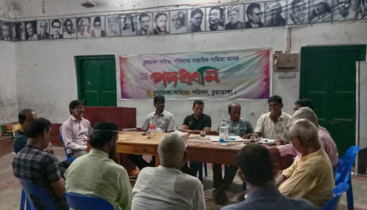গতকাল শুক্রবার সন্ধ্যায় চুয়াডাঙ্গার শহীদ আলাউল হলে চুয়াডাঙ্গা সাহিত্য পরিষদের সাপ্তাহিক সাহিত্য আসর ‘পদধ্বনি’ অনুষ্ঠিত হয়। ১৪৬৭তম এ আসরে সভাপতিত্ব করেন পরিষদের অর্থ সম্পাদক মো. আনছার আলী। প্রথমেই সূচনা বক্তব্য দেন সাধারণ সম্পাদক নজির আহমেদ। স্বরচিত লেখা পাঠ করেন আনছার আলী, এম এ মামুন, হারুন অর রশিদ, আবু নাসিফ খলিল, সুমন মালিক, হুমায়ুন কবীর, সিদ্দিক আহমেদ, ইনতাজুল ইসলাম, হোসেন মোহাম্মদ ফারুক, ডা. তোফাজ্জেল হোসেন, সুমন ইকবাল প্রমুখ। অনুভূতি ব্যক্ত করেন ডা. হেদায়েত উল্লাহ। স্বরচিত লেখার ওপর বিশদভাবে আলোচনা করা হয়। বিজ্ঞপ্তি।